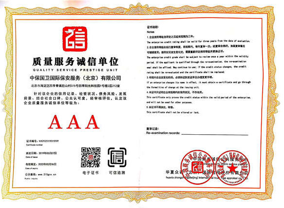 中保國衛國際保安服務(北京)有限公司,屬中保國衛集團旗下子公司。能全方位的為大型客戶提供優質的安保、押運服務,是集人防和技防于一體的新型正規化綜合安保押運服務企業,提供人防、物防、技防、聯網報*、非武裝押運等安防相關的一站式服務。
